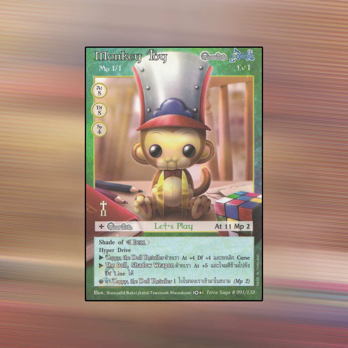 เป็นการ์ดเกม Summoner Master OG ในชุด Terra Saga II นี้จะมีการ์ดทั้งหมด 132 แบบ Monkey Toy เป็น Seal Card ธาตุ Wind เผ่าพันธุ์ Machine Musician หมายเลข 91 ระดับการค้นหา Common