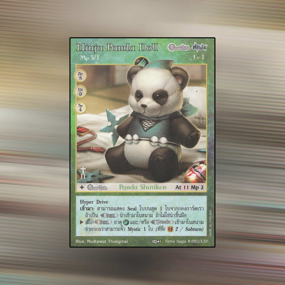 เป็นการ์ดเกม Summoner Master OG ในชุด Terra Saga II นี้จะมีการ์ดทั้งหมด 132 แบบ Ninja Panda Doll เป็น Seal Card ธาตุ Wind เผ่าพันธุ์ Machine Musician หมายเลข 92 ระดับการค้นหา Common