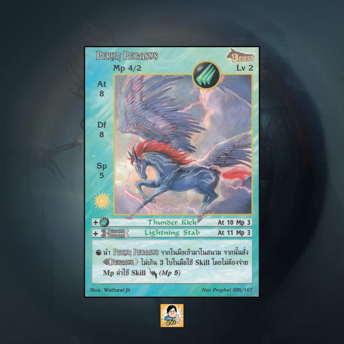 เป็นการ์ดเกม Summoner Master OG ในชุด Neo Prophet นี้จะมีการ์ดทั้งหมด 168 แบบ “Perun Pegasus” เป็น Seal Card ธาตุ Wind เผ่าพันธุ์ Beast หมายเลข 95 ระดับการค้นหา Rare