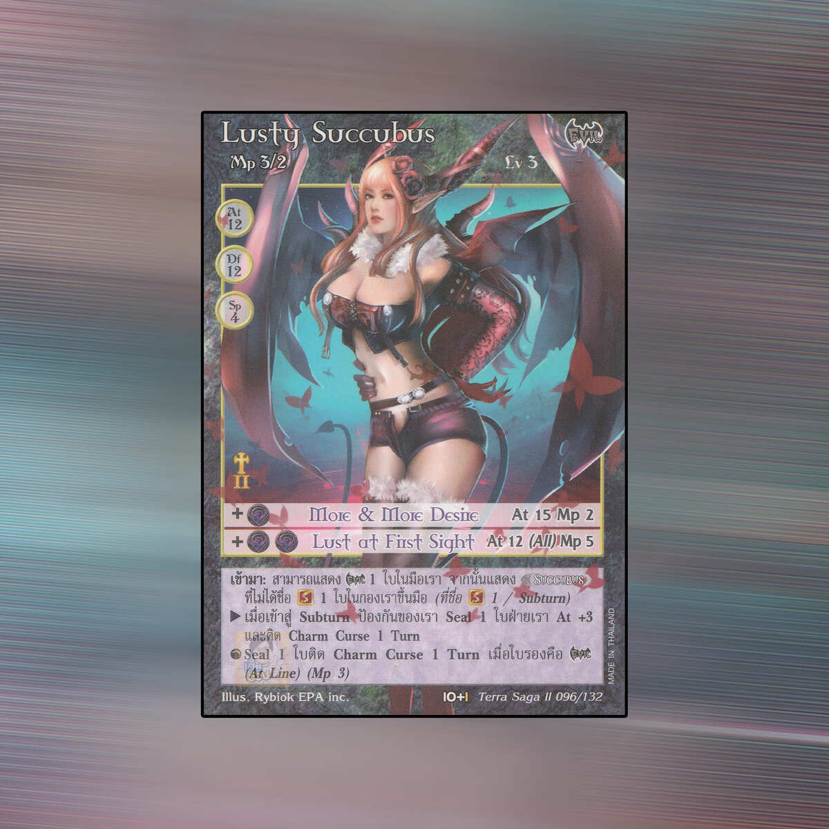 เป็นการ์ดเกม Summoner Master OG ในชุด Terra Saga II นี้จะมีการ์ดทั้งหมด 132 แบบ Lusty Succubus เป็น Seal Card ธาตุ Dark เผ่าพันธุ์ Evil หมายเลข 96 ระดับการค้นหา Rare