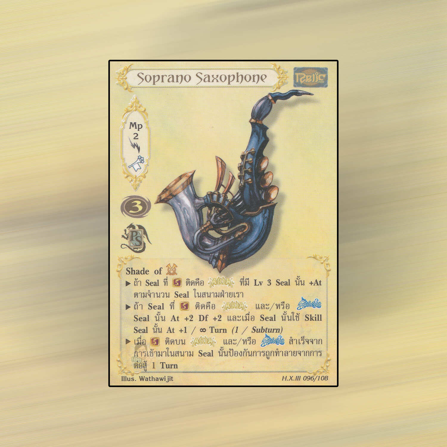 เป็นการ์ดเกม Summoner Master OG ในชุด Hymn of Exodus III นี้จะมีการ์ดทั้งหมด 126 แบบ Soprano Saxophone เป็น Mystic Card ประเภทสิ่งศักดิ์สิทธิ์ หมายเลข 96 ระดับการค้นหาเป็นการ์ดทั่วไป