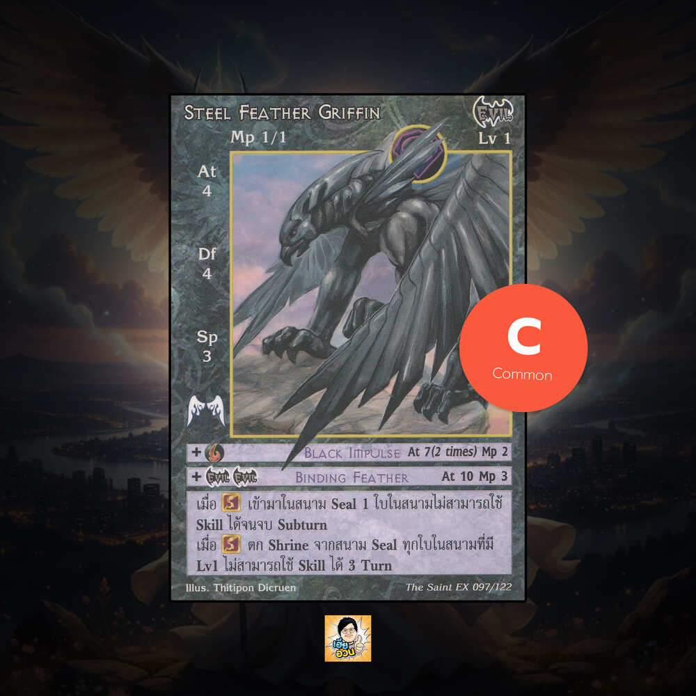 เป็นการ์ดเกม “Summoner Master OG” ในชุด “The Saint EX” นี้จะมีการ์ดทั้งหมด 123 แบบ “Steel Feather Griffin” เป็น Seal Card ธาตุ Dark เผ่าพันธุ์ Evil หมายเลข 97 ระดับการค้นหา Common