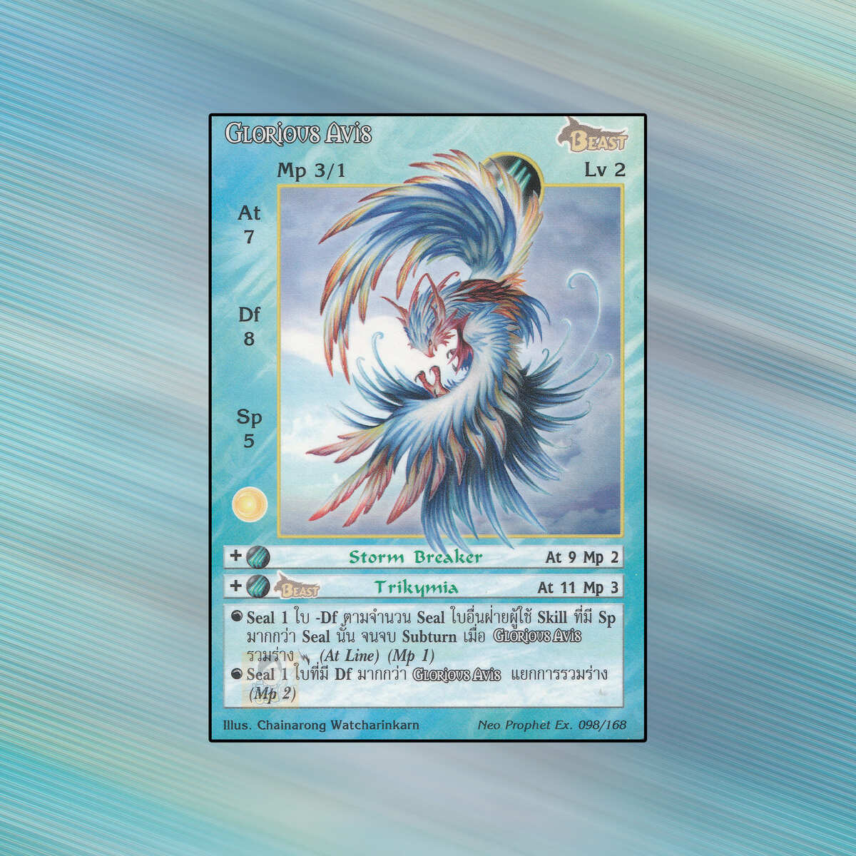 เป็นการ์ดเกม Summoner Master OG ในชุด Neo Prophet Extended นี้จะมีการ์ดทั้งหมด 169 แบบ “Glorious Avis” เป็น Seal Card ธาตุ Wind เผ่าพันธุ์ Beast หมายเลข 98 ระดับการค้นหา Rare