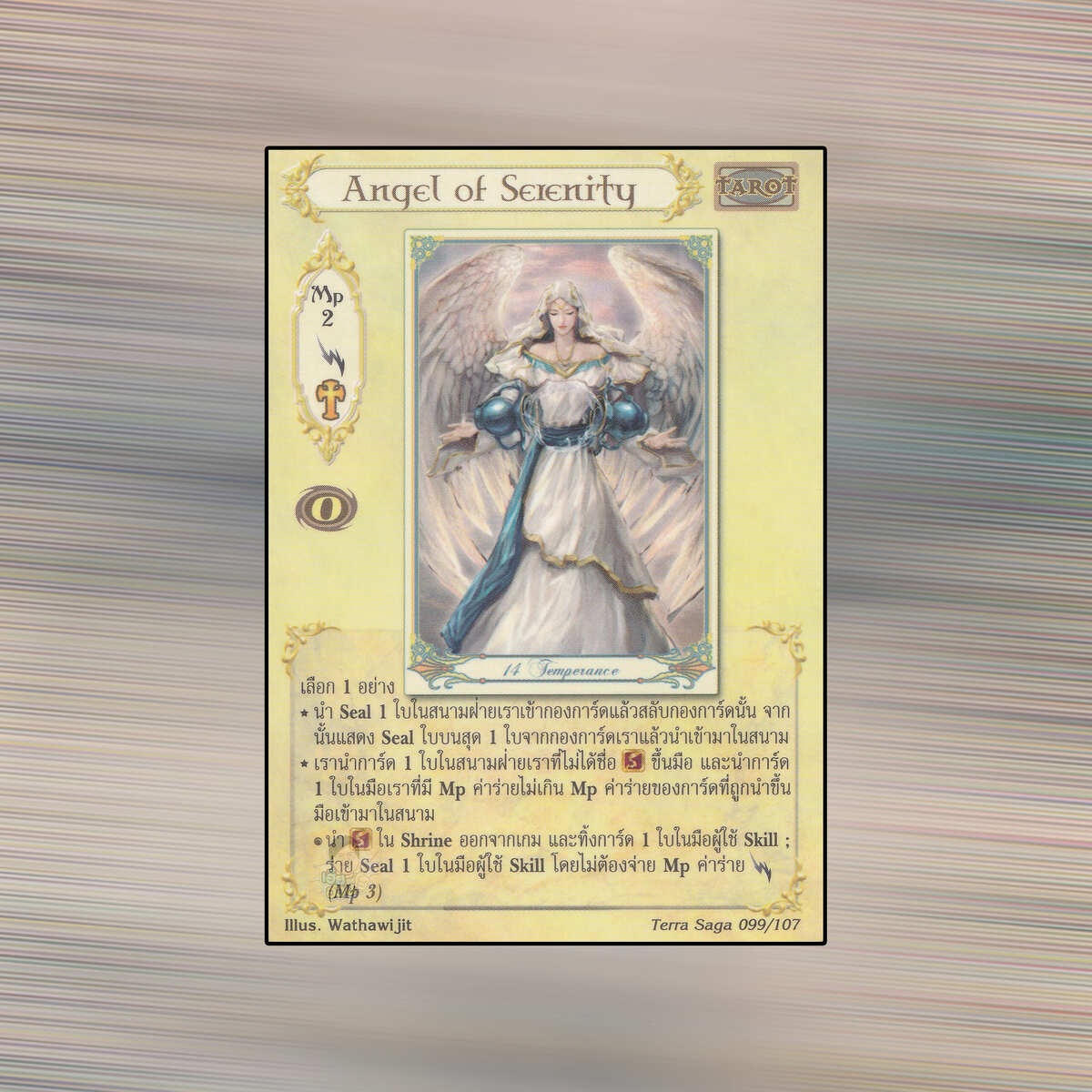 เป็นการ์ดเกม Summoner Master OG ในชุด Terra Saga นี้จะมีการ์ดทั้งหมด 108 แบบ Angel of Serenity เป็น Mystic Card ชนิด Tarot หมายเลข 99 ระดับการค้นหา Rare
