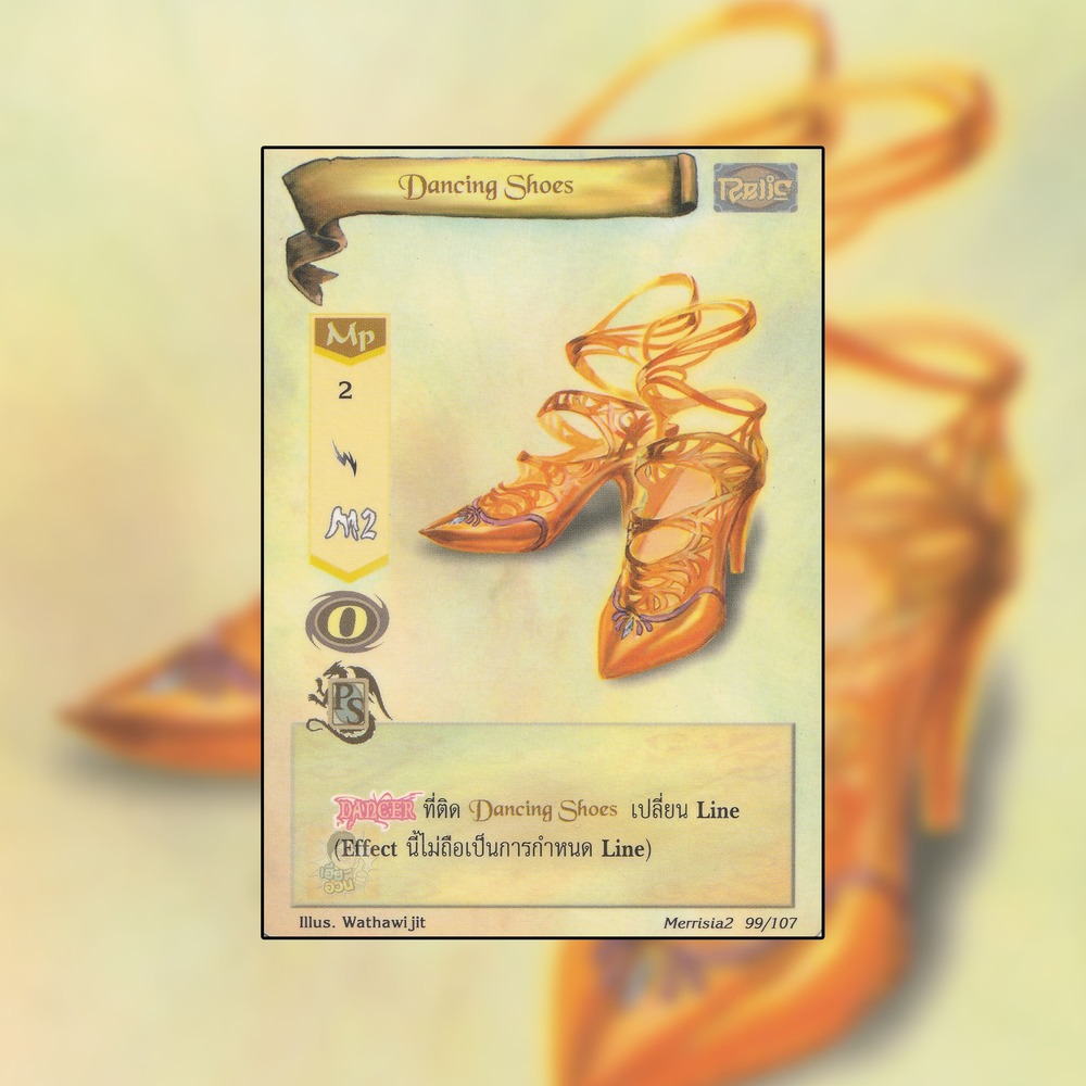 ในชุด Merrisia 2nd Impression นี้จะมีการ์ดทั้งหมด 108 ใบ Dancing Shoes เป็น Mystic Cards ประเภท Relic หมายเลข 99: ระดับการค้นหาอยู่ในระดับทั่วไป