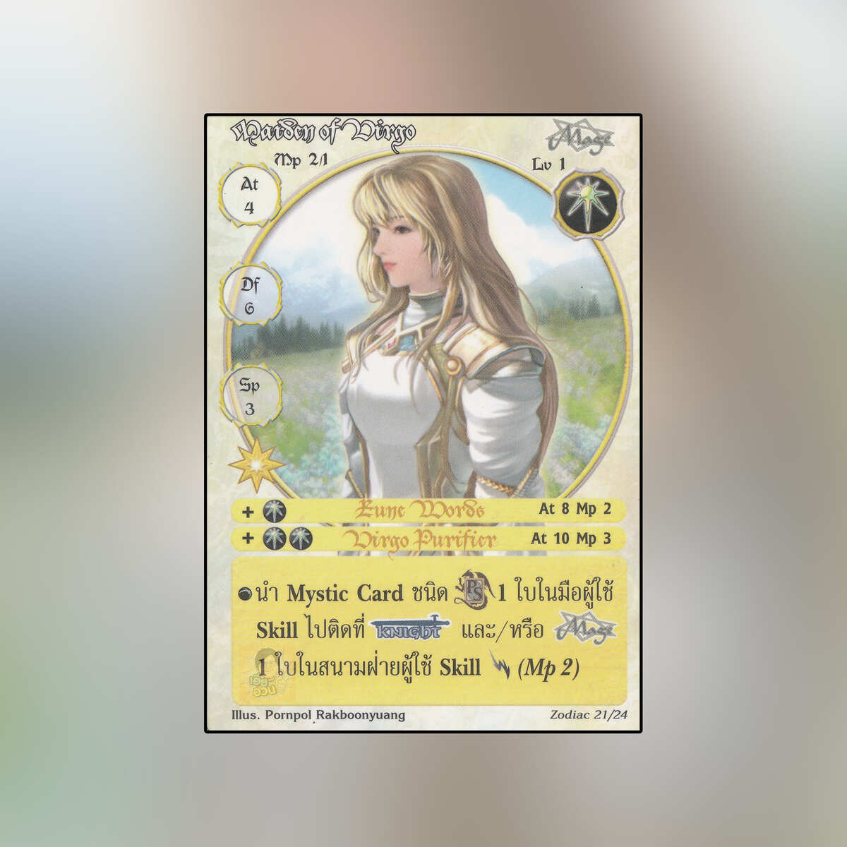 เป็นการ์ดเกม “Summoner Master OG” ในชุด “Zodiac” นี้จะมีการ์ดทั้งหมด 24 แบบ “Maiden of Virgo” เป็น Seal Card ธาตุ Light เผ่าพันธุ์ Mage หมายเลข 21 ระดับการค้นหา Special