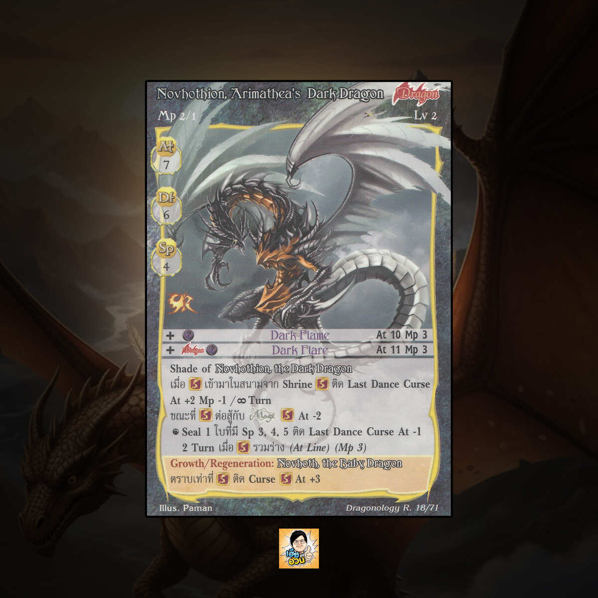 เป็นการ์ดเกม “Summoner Master OG” ในชุด “Dragonology Regeneration” นี้จะมีการ์ดทั้งหมด 72 แบบ “Novhothion, Arimathea’s Dark Dragon” เป็น Seal Card ธาตุ Dark ประเภท Dragon หมายเลข 18 ระดับการค้นหา Special