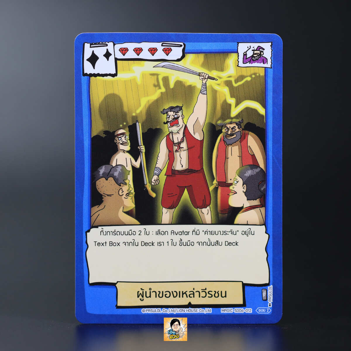 “ผู้นำของเหล่าวีรชน” จากการ์ดเกม “Battle of Talingchan” ชุด “SD06 ๖ ประจัญบาน” เป็น Magic Card จอมเวทย์ หมายเลข SD06-012 ระดับการค้นหา Common-