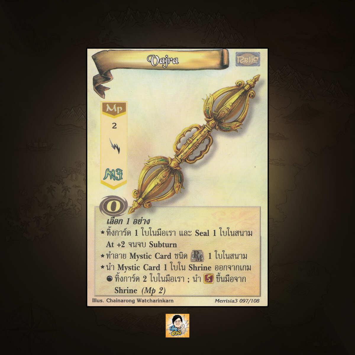 เป็นการ์ดเกม “Summoner Master OG” ในชุด “Merrisia 3rd Impression“ นี้จะมีการ์ดทั้งหมด 108 แบบ “Vajra” เป็น Mystic Card ธาตุ ประเภท Relic หมายเลข 97 ระดับการค้นหา Uncommon